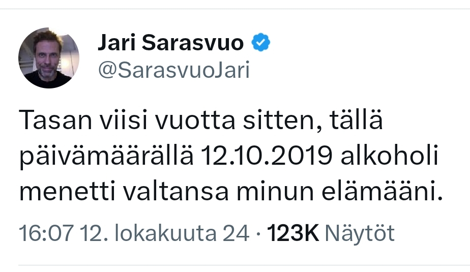 Mulle tuli jännä tunne, että lokakuussa on paljon lopettajia ja siten vuosipäiviä. Lähdin kaivelemaan aiheesta ja kyllä, lokakuu on tammikuun jälkeen suosituin aika lopettaa. Ilmiselvin vaikutus tuolla isommassa maailmassa on Sober October-kampanja, jolla on jo ilmeisen vakiintunut asema. Redditissä on, jos ei nyt massiivisesti, niin suht paljon jengiä lopettamassa lokakuussa tai ainakin yrittämässä yhtä kuukautta. Briteissä n. 15% sanoo vetävänsä tipattoman tammikuun ja vajaa 10% tipattoman lokakuun. Suomessa jälkimmäinen olisi maksa- ja munuaisliiton hyppysissä, mutta aika hiljaista ollut. Pidän hyvinkin mahdollisena, että Sarasvuon Jartsa on kansainvälisenä jamppana saanut motivaationsa brittien tai jenkkien kamppiksista ja sitten esimerkillään motivoi muita. Hyvä!
