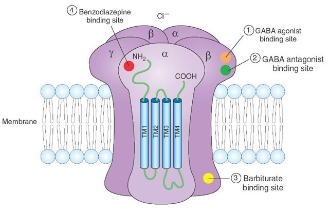 Tässä on kuva GABA-A reseptorista, johon bentsot vaikuttavat: