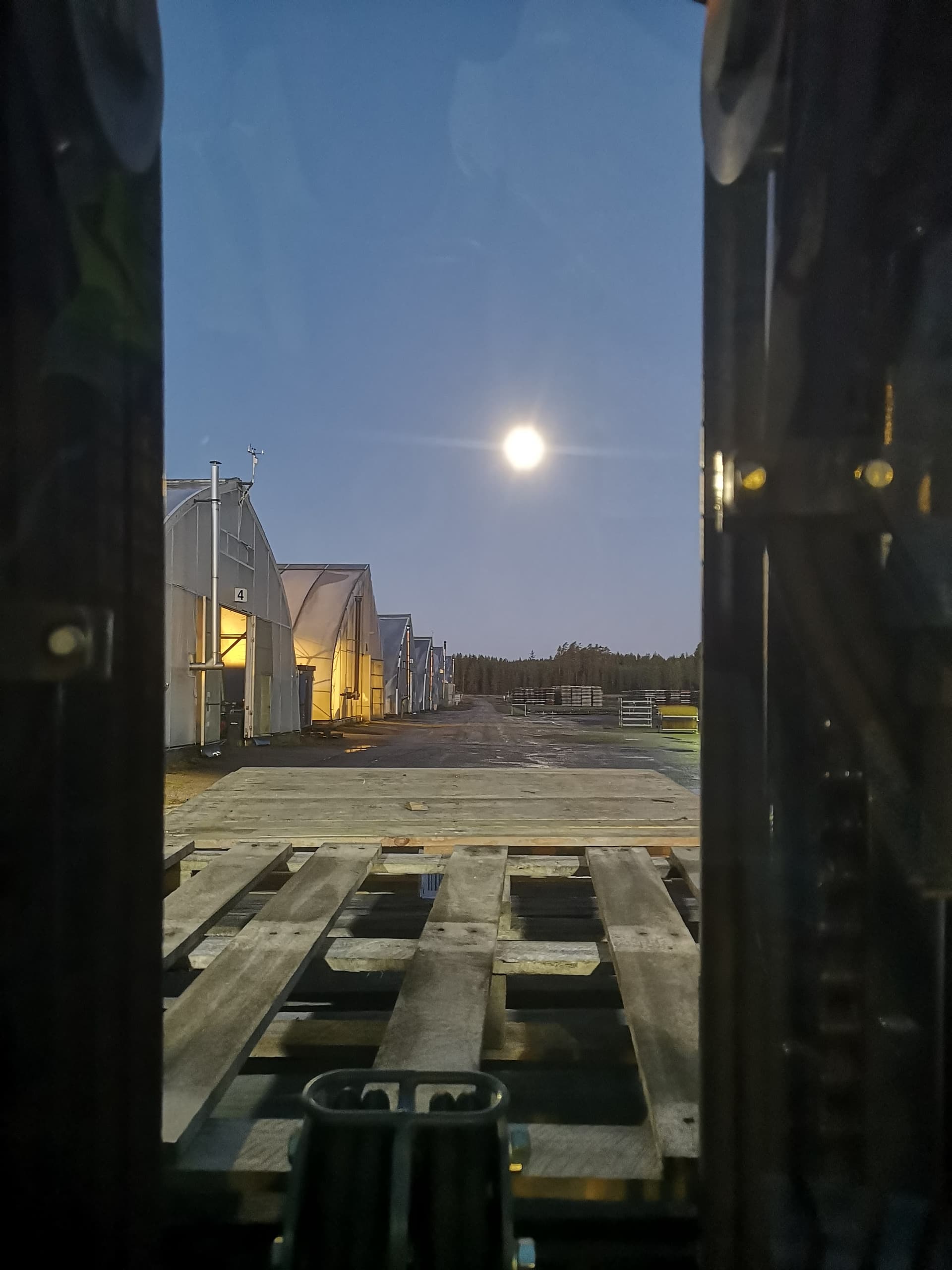 Aamulla aikaisin ajelin pienellä trukilla kasvihuoneesta pakkaamoon. Pysähdyin hetkeksi.