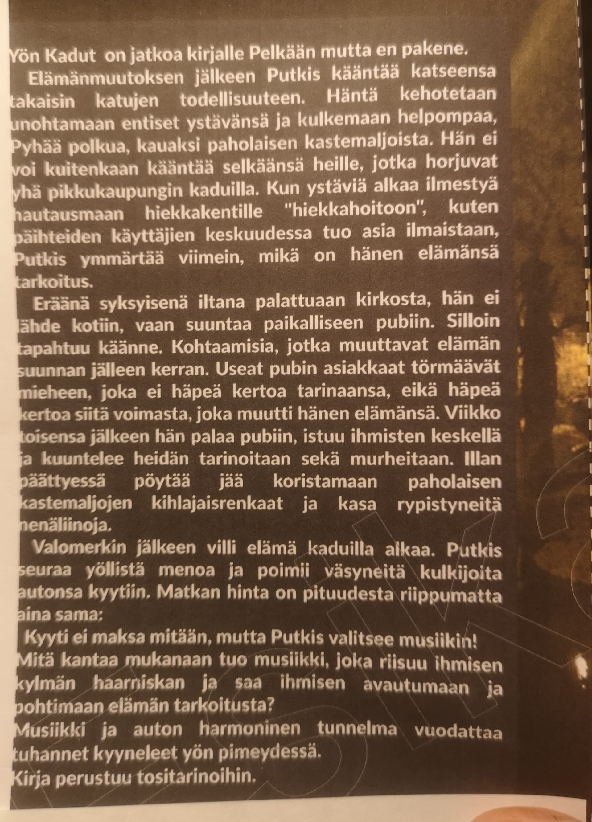 268 sivua tarinaa. Siinä on vain pieni kuvaus monen ihmisen elämästä. Se on myös kuvaus Putkiksen uudesta elämästä. Elämästä ilman alkoholia, ja elämästä “Matkaoppaan” poluilla.